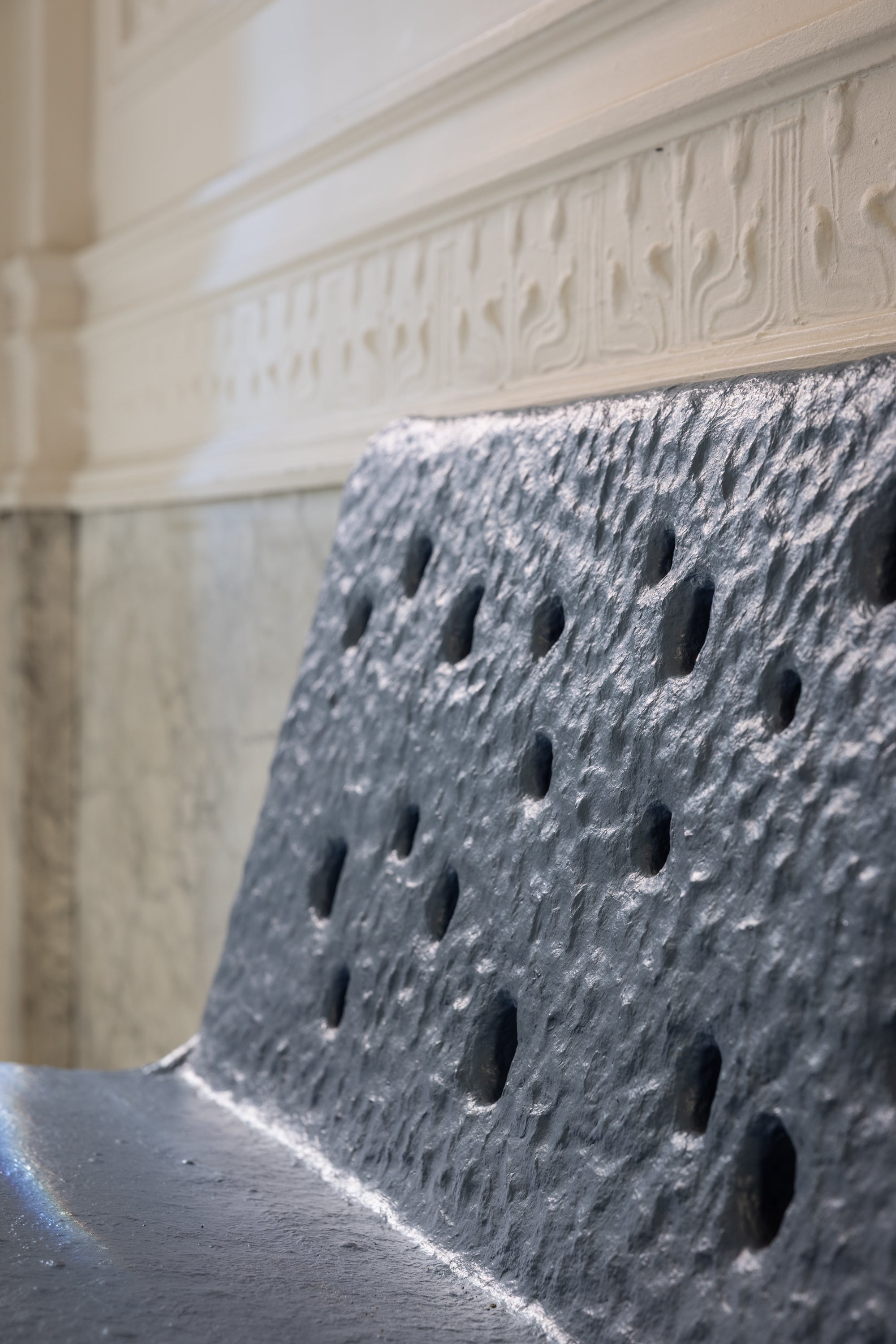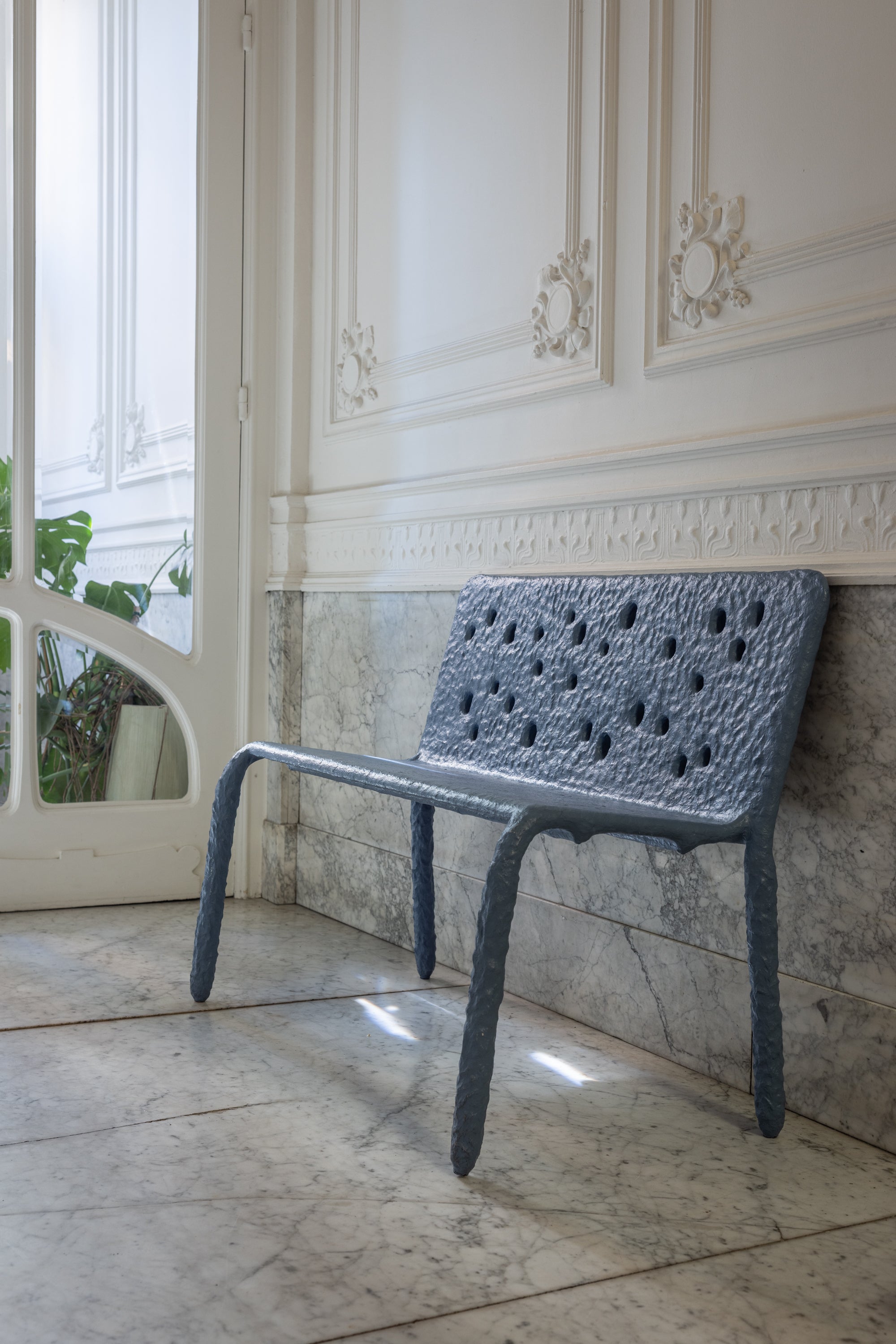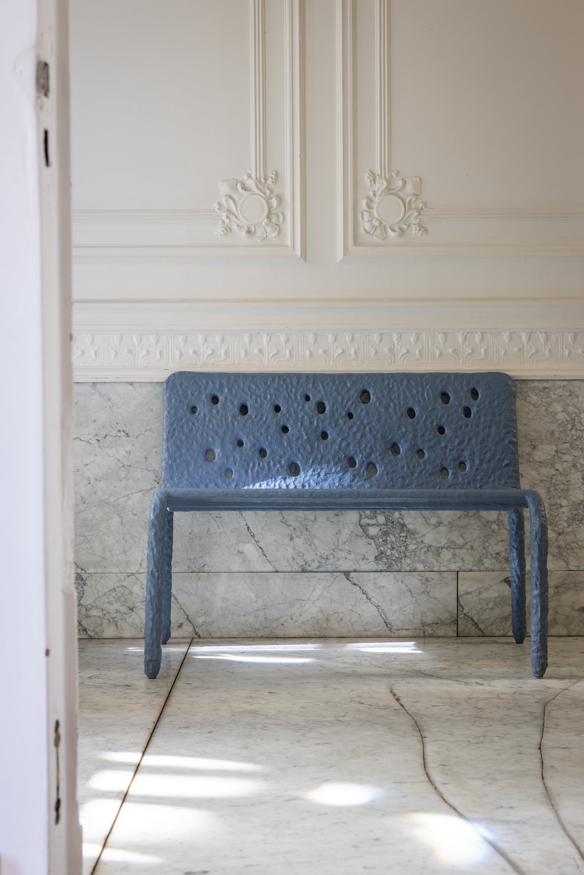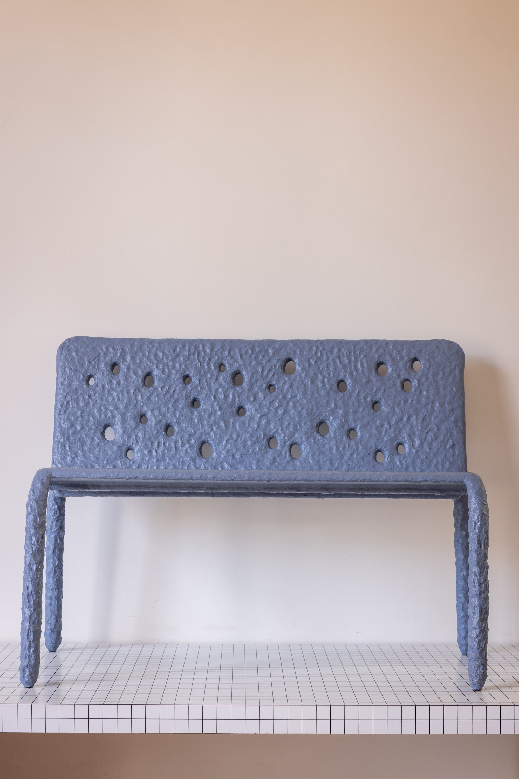 ZTISTA-bank — met de hand gevormd uit het gelijknamige materiaal van FAINA — ZTISTA is een duurzame mix van klei, hooi en andere gerecycleerde materialen, ontworpen om op een dag weer op te gaan in de natuur. ZTISTA draait om tastzin, pure energie en instinctieve gevoelens. Spontaan en tot leven gebracht door de karakteristieke gaten, is ZTISTA een stemming die alleen hier en nu bestaat. Gemaakt met een techniek vergelijkbaar met het Oekraïense ambacht valkuvannya, dat vroeger voor wandafwerking werd gebruikt, verschilt elk stuk licht, waardoor het proces van handgemaakte creatie zichtbaar wordt.